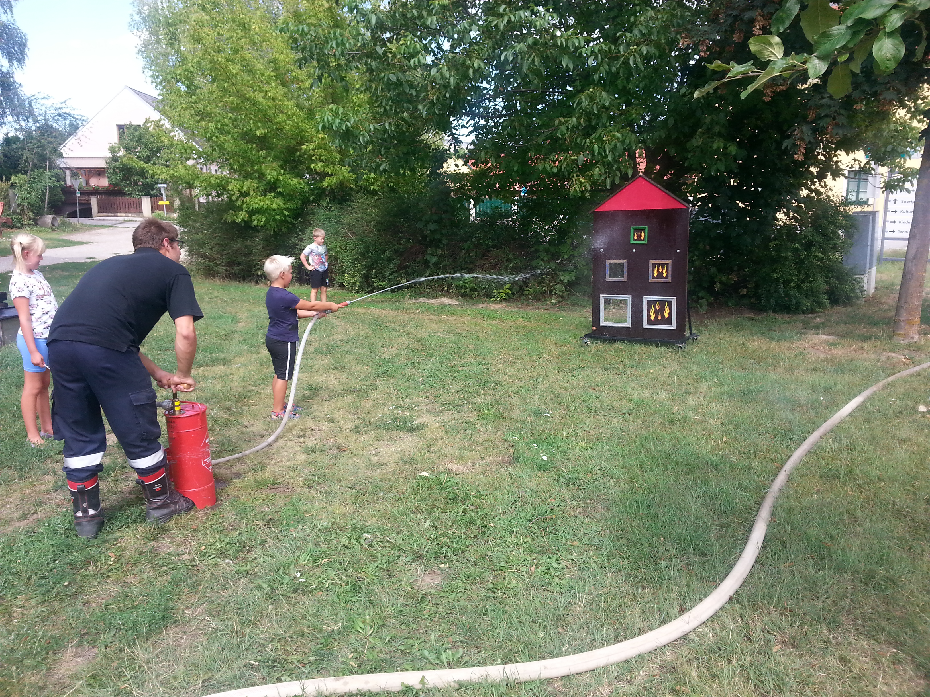 Heute konnten Kinder aktiv bei der Feuerwehr verschiedene Dinge erleben.Am Anfang wurden den Kindern und den anwesenden Erwachsenen die Gefährlichkeit eines Fettbrandes gezeigt, den man mit Wasser zu löschen versucht. Anschließend wurde mit der Kübelspritze tüchtig gespritzt. Währenddessen konnte man auch mit verschiedenen Feuerlöschern ein kleinen Gasbrand löschen. Die Kinder durften am Schluss noch mit den Feuerwehrfahrzeugen mitfahren.