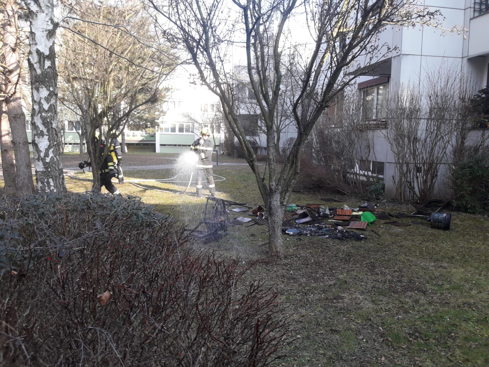 Vor Ort stellte sich heraus, dass einige Möbelstücke und Dekorgegenstände auf einem Balkon in Brand geraten waren. Unmittelbar nach dem Eintreffen und der Erkundung wurde die Brandbekämpfung mittels mehrere Kübelspritzen und Feuerlöscher von 2 Atemschutztrupps eingeleitet. Außerdem kam auch die Wärmebildkamera der FF Wolkersdorf zum Einsatz. Um die verbrannten Gegenstände sowie Glutnester ablöschen zu können, wurden die verbrannten Möbelstücke vom Balkon auf eine darunterliegende Wiese geworfen, wo diese nochmals mittels einer C-Löschleitung abgelöscht wurden.