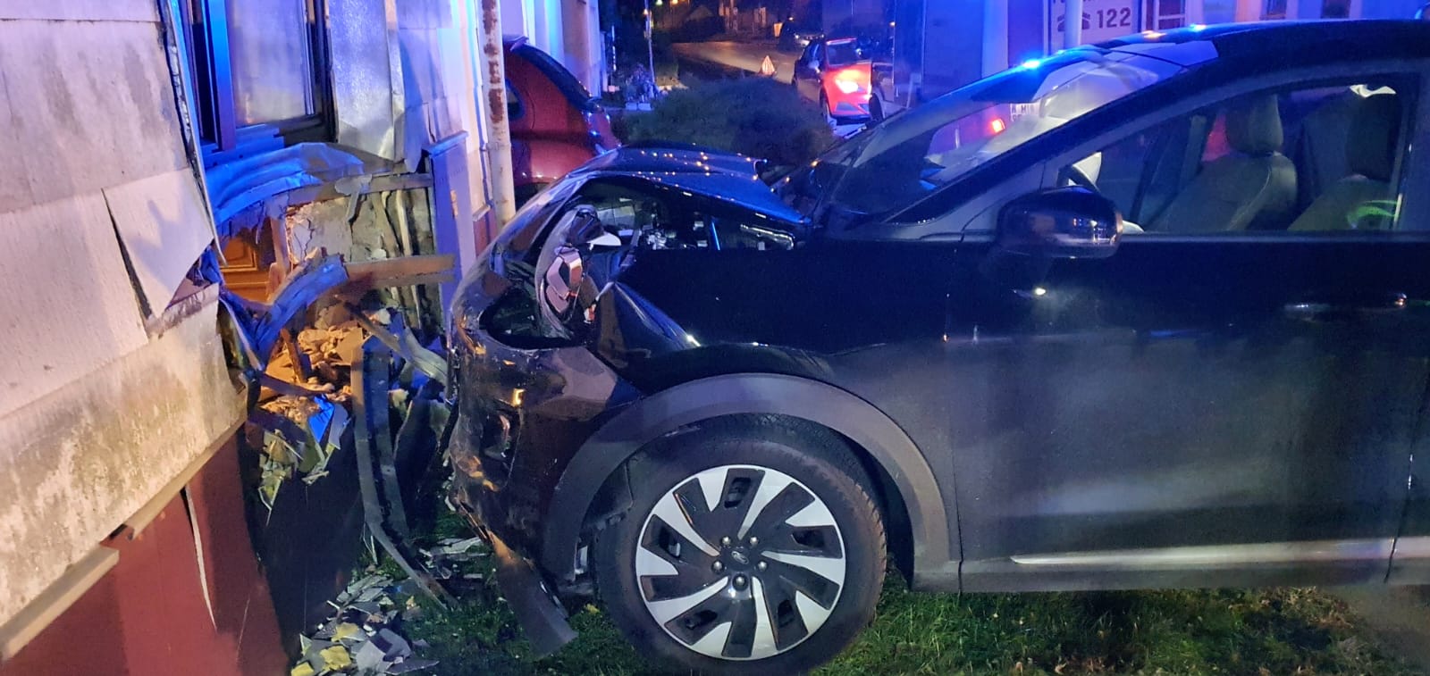 Am Einsatzort – der Kreuzung von Hauptstraße und Seyringer Straße – konnten wir folgende Lage feststellen: Ein PKW, aus Richtung Wolkersdorf kommend, war der leichten Biegung der Hauptstraße nicht gefolgt, sondern geradeaus weiter und über den Gehsteig frontal in das angrenzende Haus gefahren. Durch den Einschlag wurde die Hauswand durchstoßen und das angrenzende Zimmer verwüstet. Zum Glück befand sich zu dem Zeitpunkt kein Bewohner in diesem Bereich des Hauses.