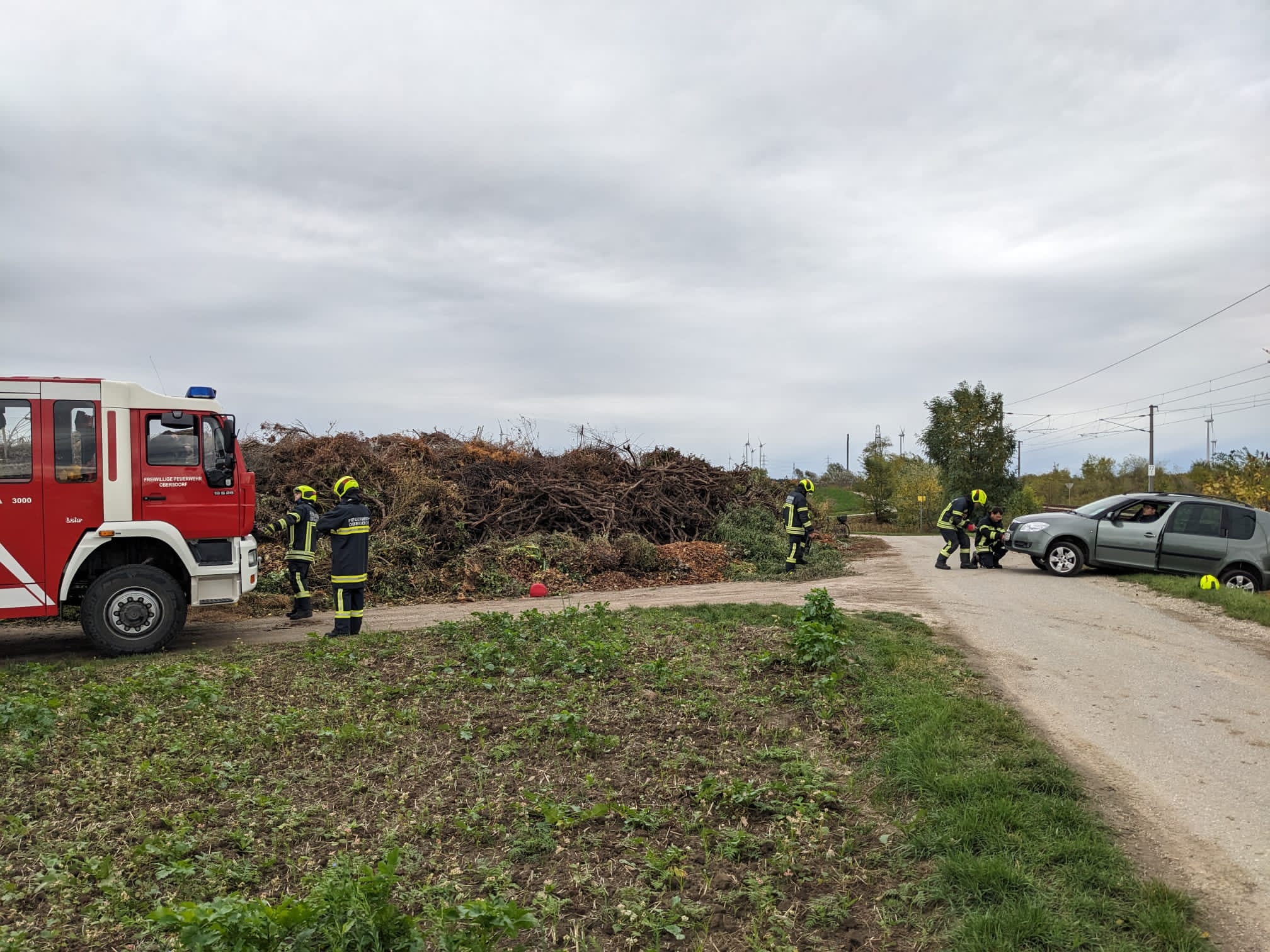Da der genaue Einsatzort nicht gleich klar war, erkundigten wir uns bei der Bezirksalarmzentrale, ob genauere Informationen bekannt sind. Währenddessen begannen wir, den Bahndamm abzufahren, um die Einsatzstelle zu finden. Noch während der Abklärung entdeckten wir den festgefahrenen PKW bei der Grünschnittlagerstelle.
