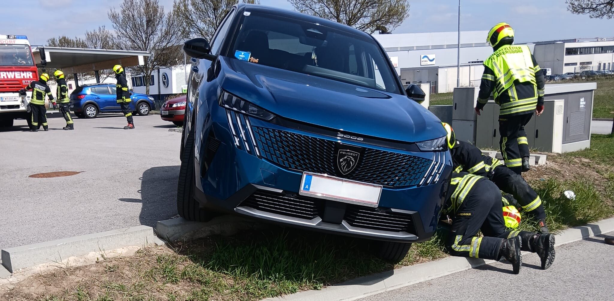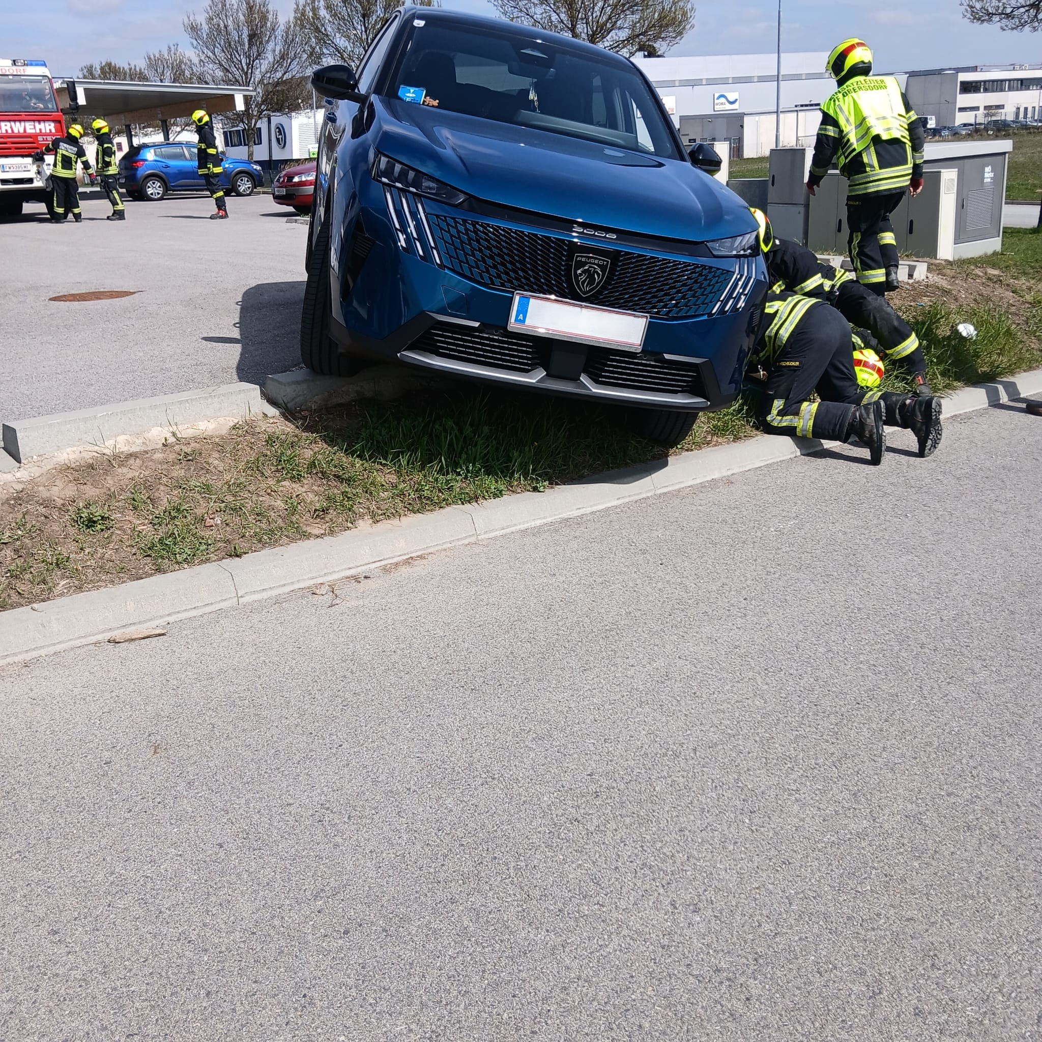 Nach wenigen Minuten konnten wir mit einem voll besetzten Tank 1 zur Unfallstelle ausrücken. Dort angekommen stellten wir fest, dass der betroffene PKW über einen Randstein gefahren ist und mit dem Unterboden aufsitzt.